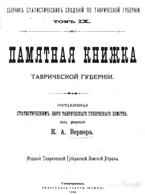 Опис Таврійської губернії, складений статистичним бюро Таврійського губернського земства під редакцією К.А Вернера. Надруковано в Сімферополі типографією газети «Крим».