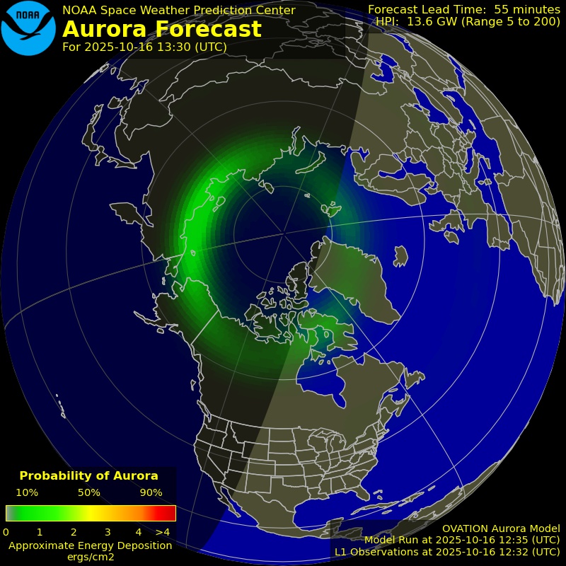Прогноз NOAA інтенсивністі та розташування полярного сяйва на найближчі 30 ‒ 90 хвилин за часом UTC по моделі OVATION.